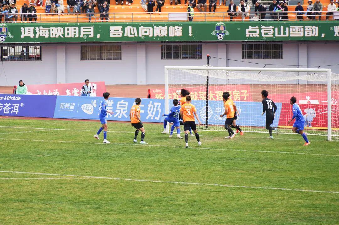 比赛第11分钟,大理队获得角球机会,队员们在对方门前奋力拼抢,最终由28号队员李凯抓住机会将球送入对方球门,帮助球队取得比分领先。
